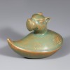 여요 특유의 은은한 비색 유약이 시유되어 표면은 잔잔한 광택을 띱니다. 부분적으로 미세한 빙렬과 유약층의 두께 변화가 나타나 자연스러운 질감을 보여줍니다. 유물 표면의 황갈색 갈변 흔적은 장기간 매장되어 생긴 것으로 보여 연적이 실사용되었는지와는 무관하게 부장품으로 추정됩니다. 굽 안쪽에는 규석을 받쳐 구운 흔적이 세 군데 있습니다.