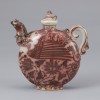 원나라 황제나 귀족의 고분에 있던 부장품인 '명기(明器)'로 추정되는 유리홍 단봉문 편주자입니다. 납작한 원형의 몸체 좌우에 봉황 머리 모양의 출수구와 손잡이가 붙어 있고, 위아래로 연봉 모양의 뚜껑이 있는 입수구(구연부)와 장방형의 굽이 붙어 있습니다. 출수구의 봉황 머리는 몸체의 커다란 날개 무늬로 연결되어 마치 봉황이 하늘을 나는 듯한 인상을 줍니다. 봉황은 태평성대에 나타나는 상서로운 상상의 동물로서 천자(天子)를 상징하며, 하부에 그려진 모란은 꽃이 크고 풍성해 부귀영화를 나타냅니다.