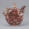 This Underglaze Red Flattened Ewer with Phoenix Design is presumed to be a mingqi (明器, burial object) originally placed in the tomb of a Yuan Dynasty emperor or aristocrat. The vessel features a flattened circular body flanked by a spout shaped like a phoenix's head and a handle. It is topped with a mouth featuring a lotus-bud-shaped lid and rests on a rectangular foot. The phoenix head on the spout connects visually to large wing motifs on the body, creating the impression of a phoenix in flight. As an auspicious mythical creature said to appear during times of peace and prosperity, the phoenix symbolizes the Son of Heaven (the Emperor). The peonies depicted on the lower section, with their large and full blossoms, symbolize wealth and honor.