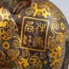 此器物描绘马与猴子。低头站立的马背上,一只猴子以四肢攀附其上。猴子的表情与姿态生动传神,马的鬃毛与猴子的毛发刻画细致,具有高度写实性。马身以金箔嵌四字铭文与旋涡纹样,装饰华丽而庄重。