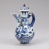 This blue and white porcelain ewer features a dragon and cloud design and dates from the late Yuan to the early Ming dynasty. The vessel has a flared mouth, a constricted neck, and a voluminous body, supported by a short, spreading foot that provides a stable form. The spout and handle are modeled after a dragon's head. The spout is crafted to look as if water flows from the dragon's mouth, while the handle resembles a dragon biting the vessel, creating a dynamic impression. The lid is topped with a bud-shaped finial and attached with a small loop, which appears to have been used to secure the lid to the ewer with a cord to prevent loss.