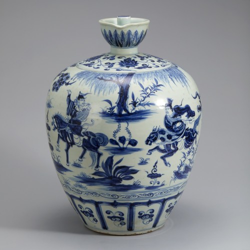 몸체 중앙에는 발색이 짙은 청화로 세 명의 장수가 전투하는 장면인 삼명장문(三名將紋)이 시문되었습니다. 세 장수가 각각 말을 타고 서로 쫓고 쫓기는 모습을 역동적으로 묘사하였습니다. 세 장수는 정양(定陽)의 유무주(劉武周), 낙양(洛陽)의 왕세충(王世充), 태원(太原)의 이연(李淵)을 가리킵니다. 이들은 수나라(隋, 581~619) 말기에 등장하였던 인물들입니다. 구연부에는 파초 문양이, 어깨에는 보상화(寶相花) 문양이 그려져 있습니다.