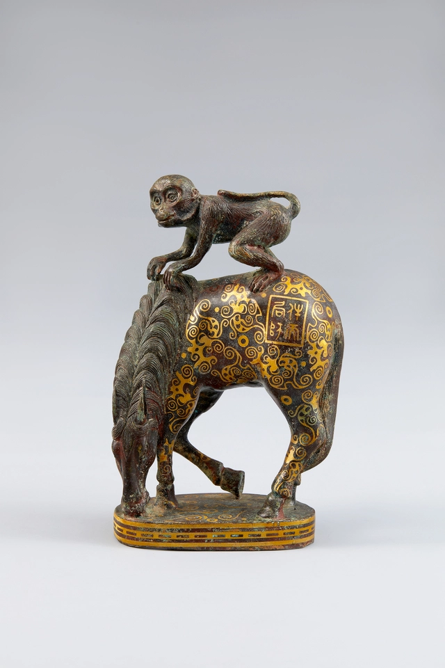 우선 눈에 띄는 청동 금상감 마상봉후상(馬上封侯像)은 춘추전국시대 유물이다. 말에 올라탄 원숭이가 곧바로 제후에 봉해졌다는 기막힌 의미를 담고 있다. 그 연대의 아득함으로 인해 감탄이 나오는데, 말과 원숭이의 모습이 웃음을 자아내기도 한다. 말 네 마리가 마차를 끄는 모습으로 조각된 옥기도 춘추전국시대에 만들어졌다.