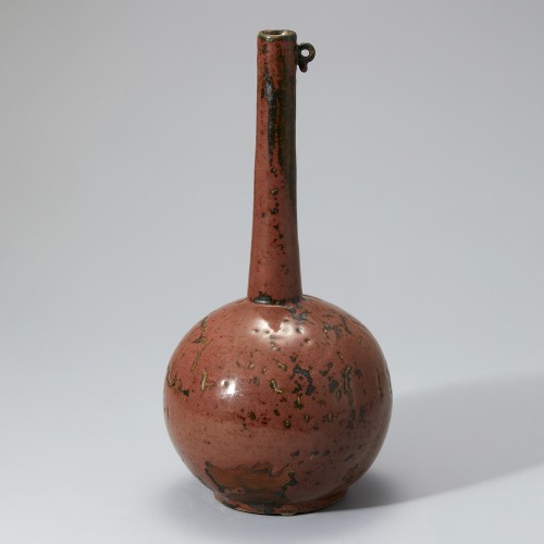 좁은 구연부와 긴 목, 구형 동체를 지닌 고려시대 장경병(長頸甁)입니다. 이러한 형태의 병은 마치 학의 머리를 닮았다고 하여 학수병(鶴首甁)이라 부르기도 합니다. 구연부 상단에는 작은 고리가 부착되어 있으며, 끈 등을 걸어 뚜껑의 유실을 방지하기 위한 연결고리로 보입니다.