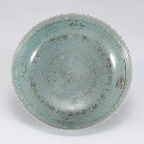 외측면선이 완만한 곡선을 이룬 발의 형태입니다. 안쪽 면에는 당초문과 여의두문, 국화문을 상감 기법으로 새겼는데 그 표면 위에 화금으로 표현한 흔적이 남아있습니다. 바깥 면에는 흑백 상감으로 국화와 당초문이 새겨져 있습니다. 굽은 다리 굽이며, 굽 안 바닥의 세 곳에 규석을 받친 흔적이 남아 있습니다. 빙렬이 있는 맑고 투명한 녹청색의 청자 유약이 전면에 입혀져 있습니다.