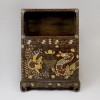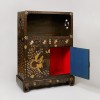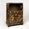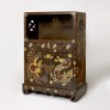 The front is lavishly decorated with dragons and phoenixes facing a wish-fulfilling jewel, rendered in mother-of-pearl, tortoiseshell, and gold leaf. This composition symbolizes authority, harmony, and prosperity. Swastika (卍) motifs are cut into the butterfly-shaped metal fittings on the side of the upper cabinet and the lower cabinet's doors.