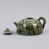 这是高丽时期半球形小型执壶,有盖,推测为砚滴之用。铁画青瓷最早在海南珍山里窑址等地开始烧造,在康津地区也多以小型器类为主,采用铁画技法装饰。