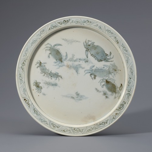 This blue-and-white porcelain dish was made in the early Joseon dynasty. It has a slightly concave base and widely flared rim, forming a broad, shallow dish. Seven crabs are delicately painted in underglaze blue, arranged around an empty central space with aquatic plants scattered in between to emphasize negative space. Each crab is depicted in a different posture and direction, creating a lively sense of movement.