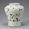 외항아리의 흙이 마르기 전에 문양을 도려내는 투각(透刻) 기법으로 모란당초문을 표현하였습니다. 어깨에는 청화로 당초문대를, 허리 아래에는 양각 기법으로 여의두문과 대선을 둘러 장식했습니다. 모란은 부귀와 번영, 당초문은 생명력과 연속성, 여의두문은 성취를 상징합니다.